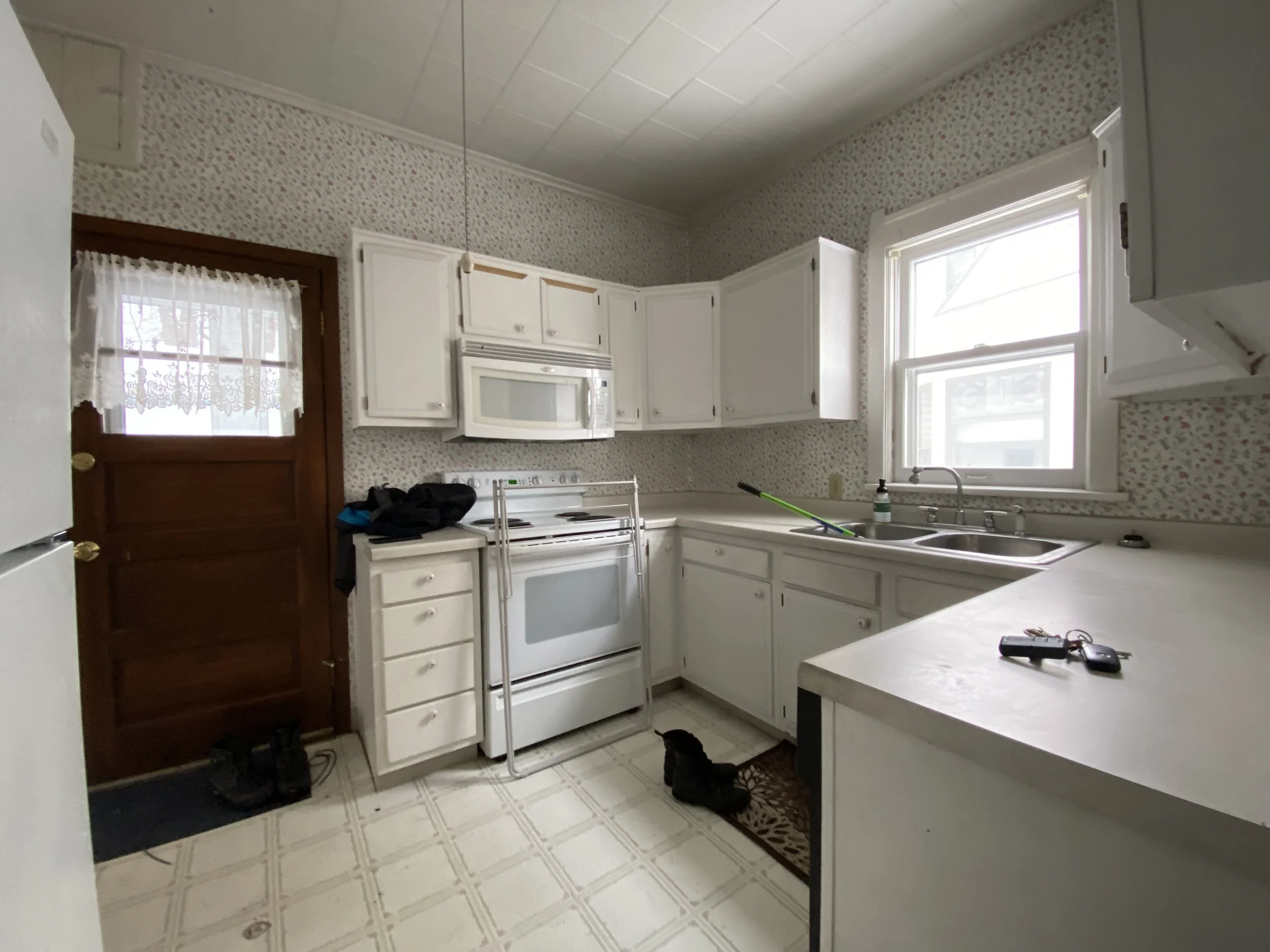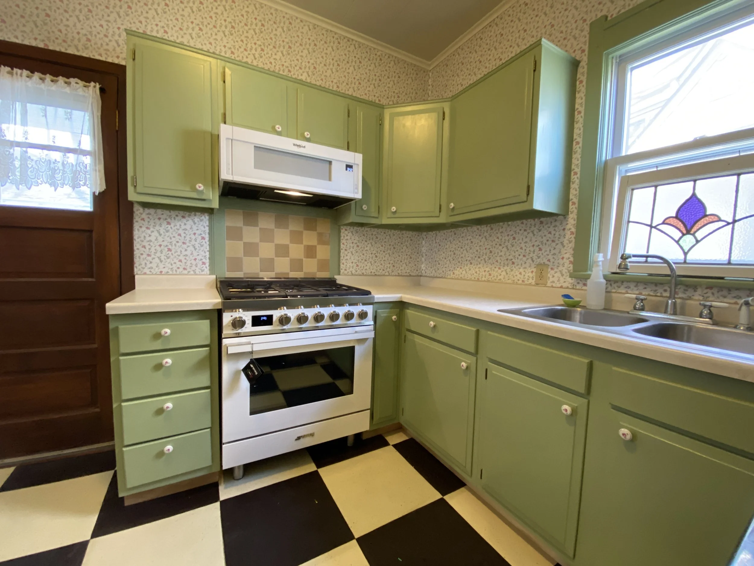 playful color, new appliances, vintage-inspired marmoleum flooring and a custom backsplash made from reclaimed tile reveals an incredibly sweet + functional kitchen and transforms original wallpaper and cabinet pulls from dated to absolutely darling.