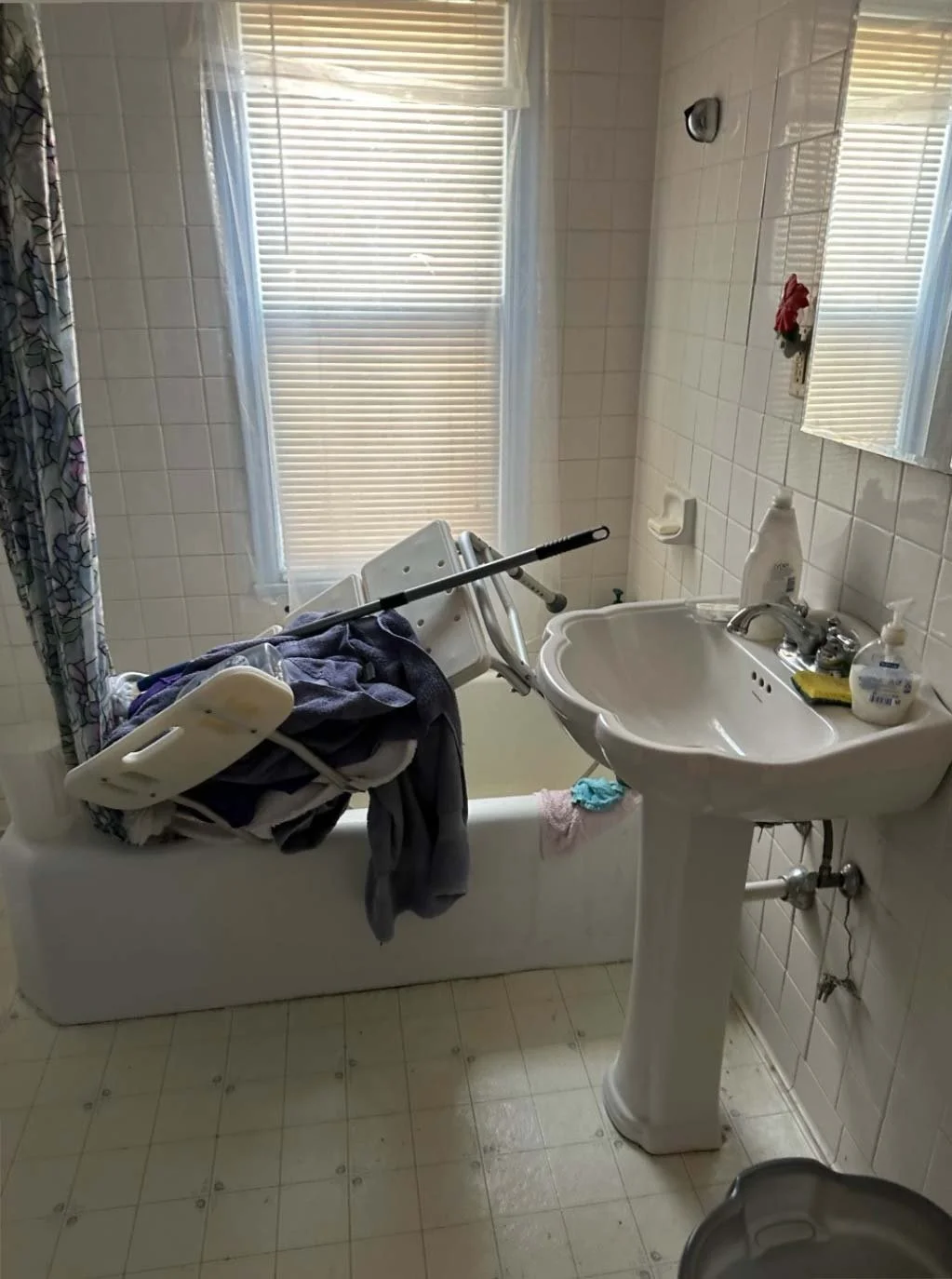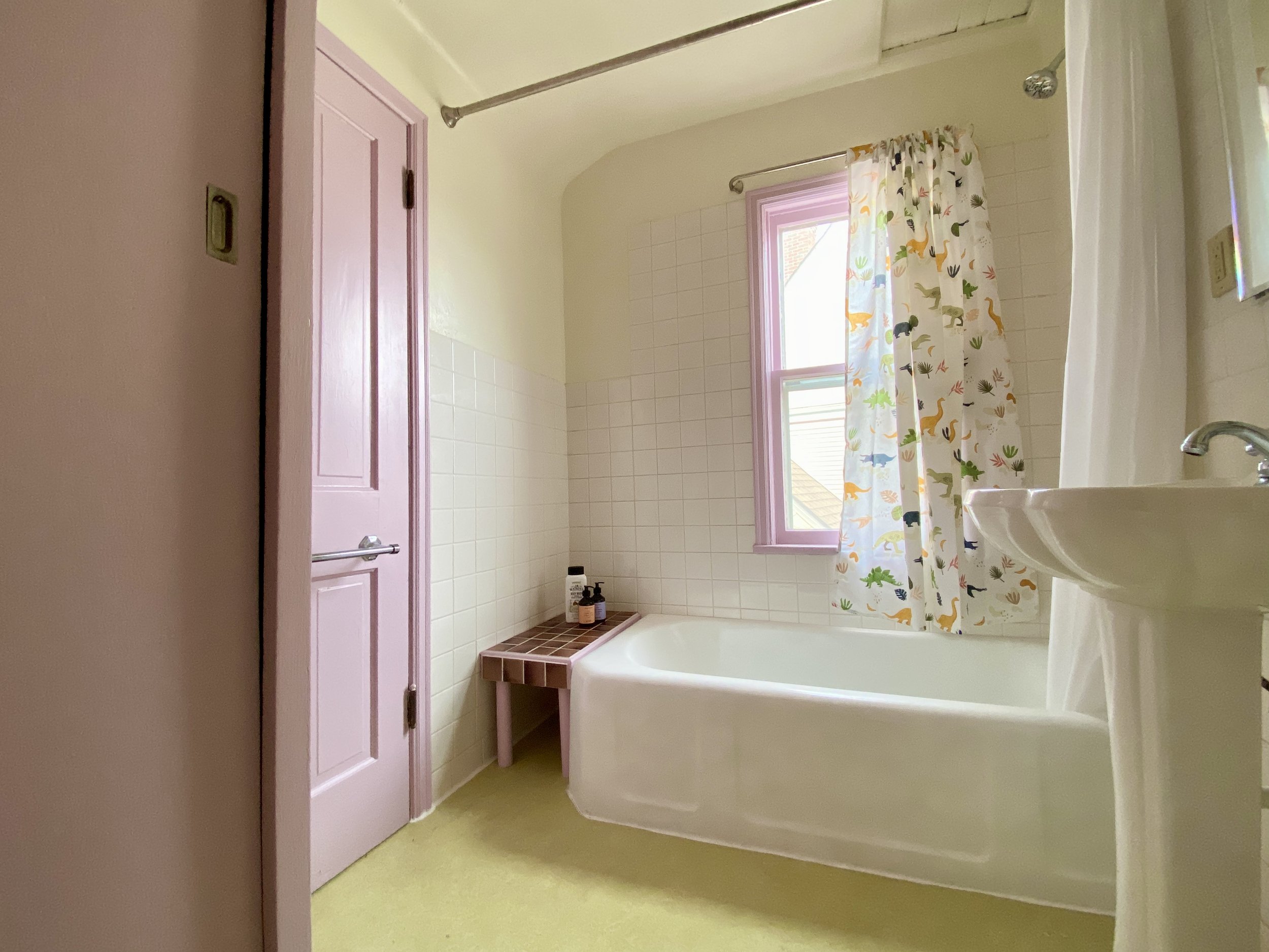 instead of a complete tear out and remodel, this original bathroom shines like new with fresh paint, updated marmoleum flooring, and a custom tiled bench tucked into formerly wasted space.
